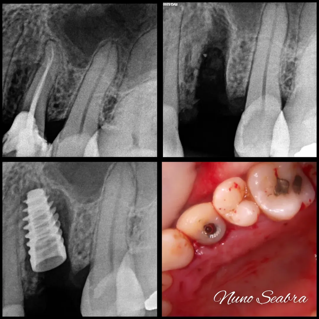Nas imagens, é possível acompanhar a sequência completa: desde as radiografias iniciais com o dente comprometido, passando pela fase cirúrgica com a extração e colocação do implante, até ao provisório aparafusado em posição. A radiografia final confirma o bom posicionamento do implante e o preenchimento adequado do gap vestibular.